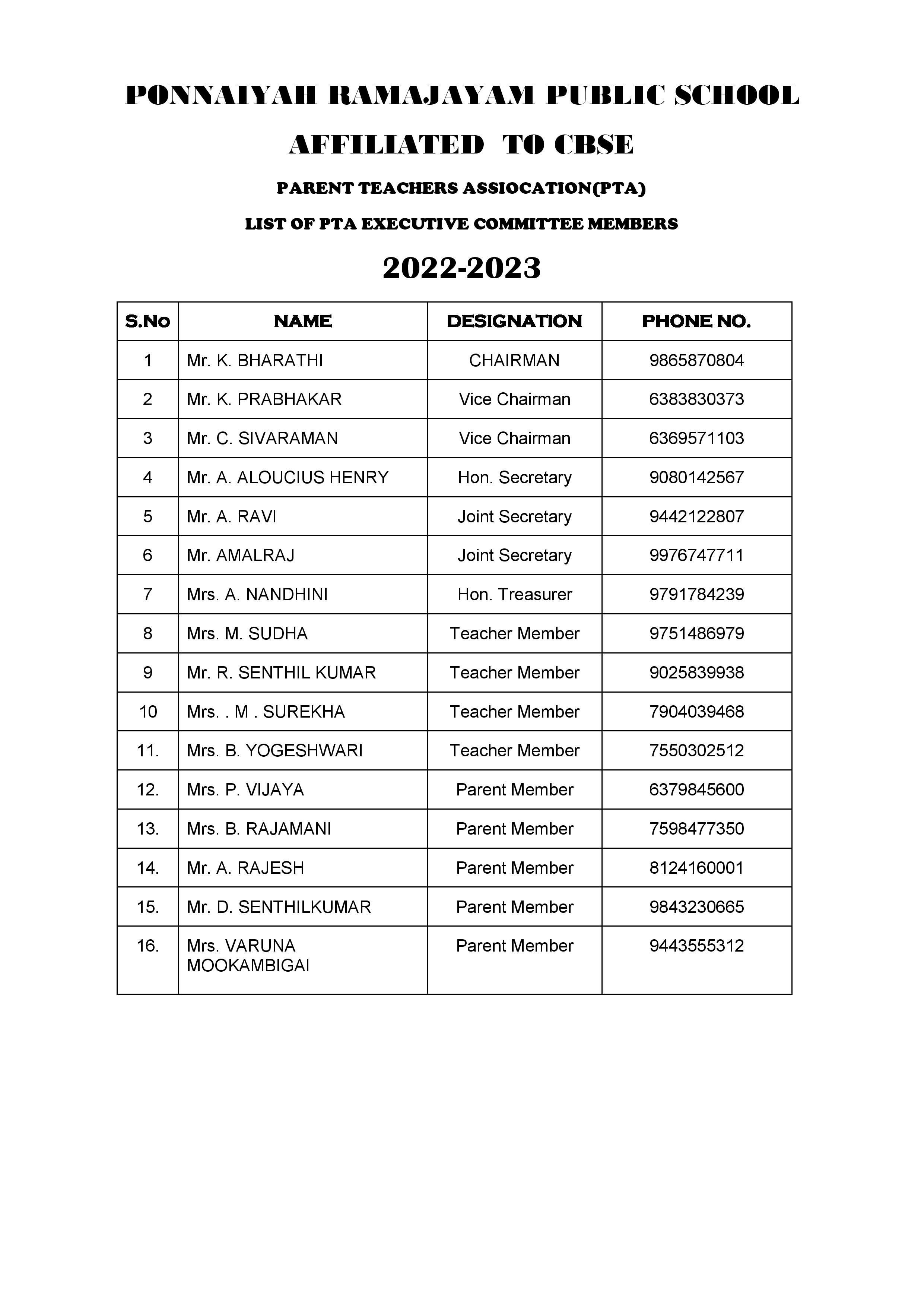 LIST OF PTA EXECUTIVE COMMITTEE MEMBERS